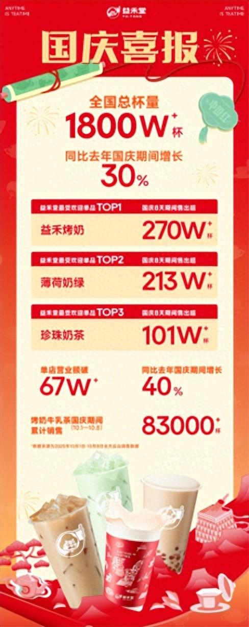 产品力与情感共鸣的完美结合,直接转化为了惊人的销量。数据显示,双节期间“小红杯”益禾烤奶售出超270万杯。除了“小红杯”新品表现突出,益禾堂另两款经典产品也展现出持续的生命力:薄荷奶绿与珍珠奶茶分别售出超213万杯和101万杯。