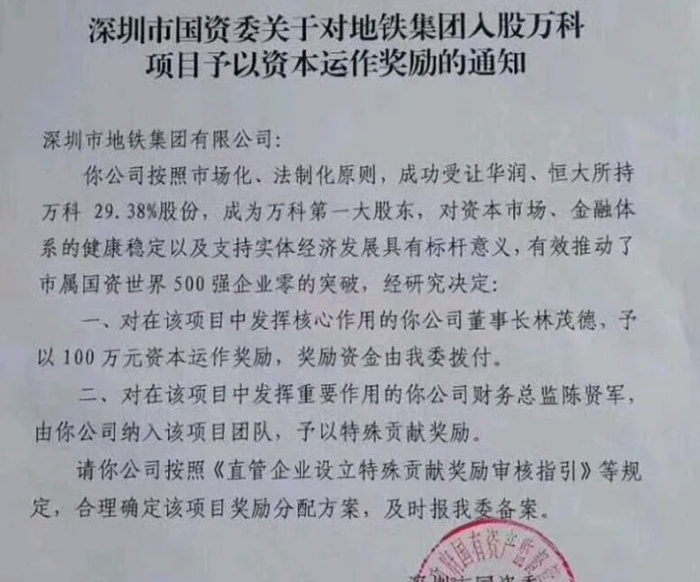 有趣的是,当时为了庆祝这一资本运作盛举,深圳市国资委特别拿出100万元奖金发给深铁集团时任董事长林茂德,另外还对深铁财务总监陈贤军予以特殊贡献奖励。