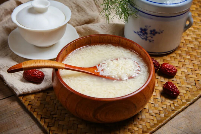 米酒酒度极低,吃法多样,用途广。年节时,母亲用米酒给我们解馋。她将糍粑切块与米酒同煮,甜而不腻,香软可口;或与汤圆同烹,软绵甜润。冬天吃完浑身发热,有取暖功效。米酒还助消化、提神解乏、促循环、美颜润肤,是产妇坐月子良品。
