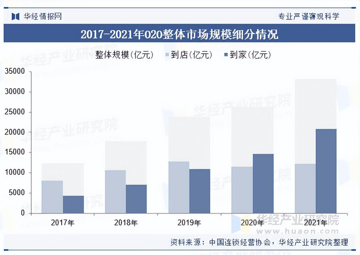 O2O整体市场主要由到家业务与到店业务组成,凭借其模式能打通线上线下、提高传统商业运营效率的优势获得众多企业的青睐,市场飞速扩容,2021年O2O市场规模已扩至33160亿元,市场成熟度正快速提高。