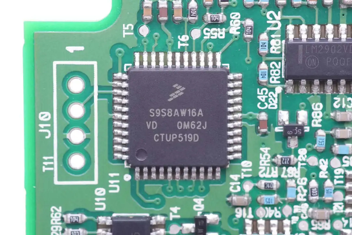 无标单片机特写,用于保护信号采集和屏幕驱动控制。