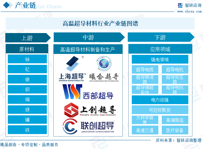 高温超导材料行业产业链由上游矿产资源、中游超导材料制造和下游应用产品开发三部分构成。上游以稀土矿、银矿、铜矿等金属矿产为核心,为中游提供铌、钛、钇、钡等关键原材料,其供应稳定性与价格波动直接影响全产业链成本;中游聚焦第二代高温超导带材(如REBCO、YBCO)的研发与规模化生产,通过化学气相沉积(CVD)、粉末装管法(PIT)等工艺实现千米级连续制备,突破生产效率与产品良率瓶颈,推动成本下降;下游覆盖强电与高场两大方向,强电领域包括超导电缆、超导限流器等电力装备,高场领域涵盖可控核聚变装置、医疗MRI设备、大科学装置及高端制造磁体等。目前,超导磁体类应用产业化进展最快,正加速替代传统磁体以提升磁场强度与稳定性。