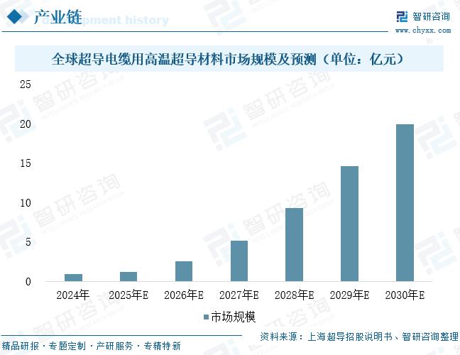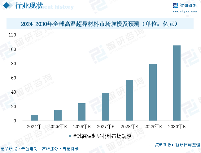 高温超导材料作为21世纪极具战略价值与产业爆发力的前沿新材料,正加速突破实验室边界,在能源传输、医疗影像、磁悬浮交通、国防装备及大科学装置等领域开启规模化应用新篇章。伴随可控核聚变装置磁体系统、智能电网超导限流器、高端医疗MRI设备等核心场景的技术突破与商业化落地,全球高温超导产业进入高速增长通道。数据显示,2024年全球市场规模已跃升至7.9亿元,同比激增77.3%;预计至2030年将突破百亿规模,达105亿元,期间年复合增长率持续保持53.9%的强劲态势,成为新材料领域最具颠覆性潜力的赛道之一。