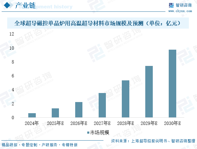 超导磁控技术作为半导体材料制备领域的革新性突破,通过在单晶炉内构建强稳态磁场,可精准抑制熔体热对流、降低氧杂质掺入,使晶体生长界面稳定性提升30%以上,有效破解同心圆缺陷与黑芯问题,助力单晶硅纯度突破9N级并实现产能倍增。当前低温超导磁控单晶炉占据主流,但高温超导技术凭借更宽的工作温区与低失超风险特性,正加速替代传统方案。在"双碳"战略与半导体自主化浪潮下,该技术成为光伏N型电池转型与第三代半导体材料国产化的关键支撑。其中,联创超导全球首台高温超导磁控单晶炉已进入量产验证阶段,推动行业进入设备迭代周期。数据显示,2024年全球超导磁控单晶炉用高温超导材料市场规模达0.6亿元,随着头部企业产能释放,预计2030年将激增至9.7亿元,2024-2030年复合增长率达60.2%,开启半导体高端装备国产化新纪元。