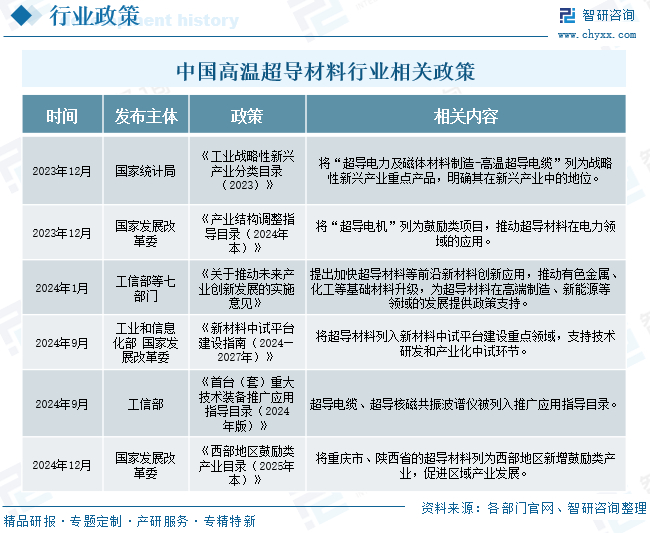 高温超导材料作为推动能源革命、高端装备升级与前沿科技突破的战略性新兴材料,凭借其零电阻、强磁场等独特性能,在智能电网、可控核聚变、量子计算等领域展现出不可替代的应用价值,因而受到国家层面的高度关注与战略布局。近年来,我国围绕高温超导材料全产业链发展需求,相继出台《工业战略性新兴产业分类目录(2023)》《产业结构调整指导目录(2024年本)》《关于推动未来产业创新发展的实施意见》《新材料中试平台建设指南(2024—2027年)》《首台(套)重大技术装备推广应用指导目录(2024年版)》《西部地区鼓励类产业目录(2025年本)》等政策,引导区域资源集聚,形成了覆盖基础研究、技术突破、产业应用的全链条政策支持体系,为高温超导材料加速迈向规模化、高端化、国际化发展提供了坚实保障。
