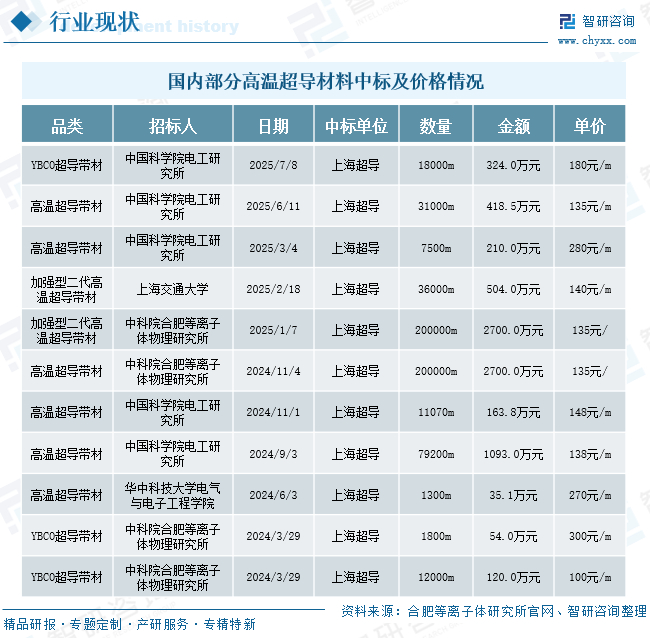 中国高温超导材料研究虽起步较晚,但凭借国家科技重大专项与产业政策的强力驱动,已实现从跟跑到并跑领跑的跨越式发展,在二代YBCO带材制备、千米级长带连续化生产等核心技术领域跻身世界第一梯队。以上海临港、北京怀柔、西安光机所、沈阳材料实验室为代表的四大产业集群加速崛起,其中上海超导率先突破20万米级单笔订单量产能力,产品单价较国际同类产品降低40%(100-300元/米区间),成功打入中科院EAST托卡马克、上海高研院超导储能等国家重大工程供应链。从中标情况看,2024-2025年7月,中标中科院、上海交大等科研机构订单超60万米,覆盖YBCO、加强型二代带材等主流品类,单价呈现明显下降趋势(从300元/米降至100-180元/米),其中中科院合肥等离子体所单笔20万米订单规模凸显核聚变等国家重大工程需求牵引效应,价格竞争与技术迭代双轮驱动产业成熟度持续提升,为高温超导材料在智能电网、可控核聚变等领域的商业化应用奠定坚实基础。