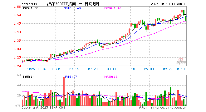 10月13日,截止午间收盘,沪深300ETF招商(561930)跌1.80%,报1.473元,成交额290.99万元。沪深300ETF招商(561930)重仓股方面,贵州茅台截止午盘跌0.98%,宁德时代跌3.64%,中国平安跌1.04%,招商银行跌0.62%,兴业银行涨0.00%,长江电力涨0.14%,美的集团跌1.55%,紫金矿业跌2.36%,比亚迪跌2.57%,东方财富跌2.76%。