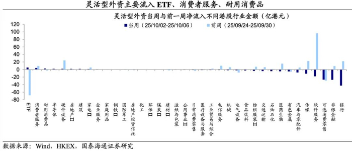 灵活型外资主要流入消费者服务、耐用消费品,流出银行、非银金融、可选消费零售。从历史走势来看,当市场波动明显放大期间,传统价值板块补涨概率较高。