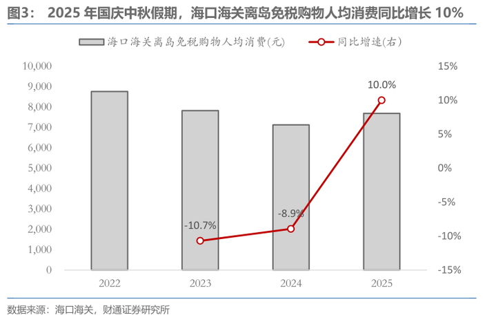 无独有偶,以免税品为代表的国内高端消费也在复苏。今年国庆中秋假期,海口海关离岛免税金额9.44亿元,购物人数12.29万人次,人均购物金额7685元,较去年同期分别增长13.6%、3.2%、10%。