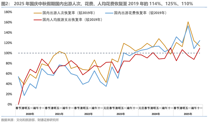 文旅部数据显示,今年国庆中秋假日8天,国内出游8.88亿人次,国内出游总花费8090.06亿元,较2024年同期分别增长16.1%、15.4%,国内旅游消费总量有较为可观的增长。