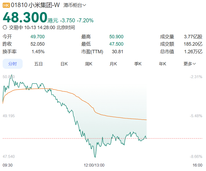 小米港股暴跌7% 江南都市报 《江南都市报》官方账号 2025.10.1314:46 关注 10月13日下午,截至发稿时,小米港股跌7.20%,报48.3港元/股。 值班编辑:喻妍校对:张竹影值班主任:范俊杰值班编委:朱晓晖