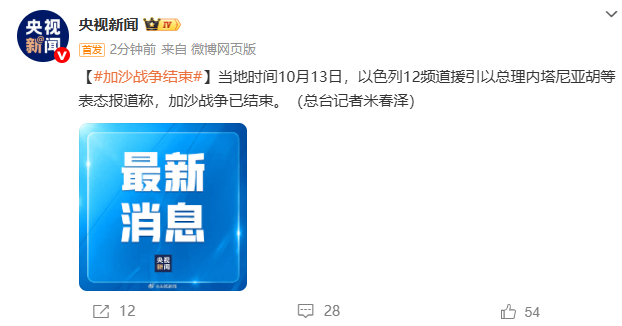 以色列总理:加沙战争结束 中国新闻网 中国新闻网官方账号 10月13日16:34 关注 听新闻 当地时间10月13日,以色列12频道援引以总理内塔尼亚胡等表态报道称,加沙战争已结束。 编辑:王伊萌责编:张曦