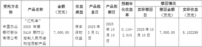 公司于2025年3月28日购买了中国农业银行股份有限公司发行的“汇利丰”2025年第5419期对公定制人民币结构性存款产品,截至本公告日,公司已赎回上述产品,获得本金及收益合计人民币70,081,022.99元,具体情况如下: