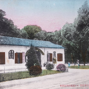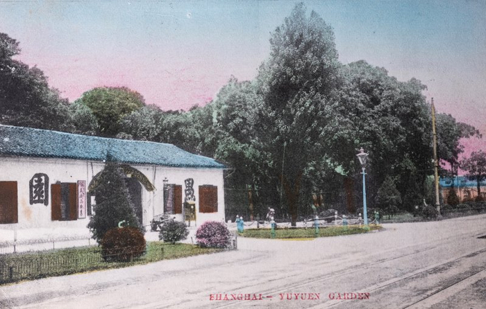 一张120年前的明信片,留下了当时上海西区著名花园“愚园”的影像。门前是宽阔安静的马路,两侧绿树高耸,入口处有一排平房,门口招牌写着“内有美术品发售”,房顶被手工上色绘成青蓝色。