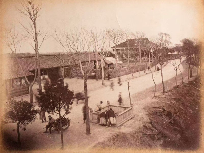 展览中有一张19世纪80年代静安寺区域的老照片。照片中央是古井“涌泉”,有几个人围在泉边。不远处的树下,有车夫坐着歇脚。画面右侧,依稀可见河流。背景处,还可以远眺到1882年开业的申园的主楼。