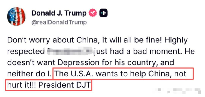 别担心中国,一切都会好起来的!中方只是经历了一个糟糕的时刻,他不想让他的国家陷入萧条,我也不想。美利坚合众国是想帮助中国,而不是伤害它!!!总统DJT