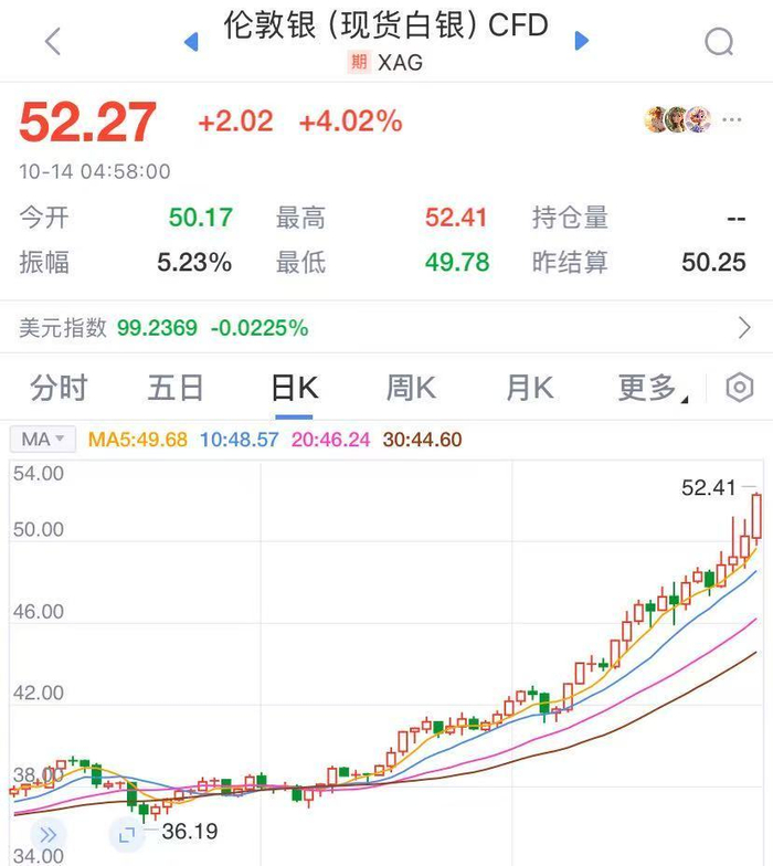 现货白银持续走高日内涨幅扩大至4.02%,报52.27美元/盎司。