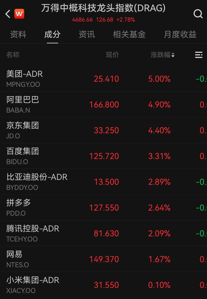 中概股大涨,纳斯达克中国金龙指数涨3.21%,万得中概科技龙头指数涨2.78%。个股方面,世纪互联涨超10%,阿里巴巴、京东集团涨超4%。