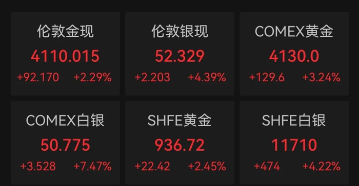 贵金属期货市场走强。截至当地时间10月13日收盘,伦敦银现价格涨4.39%,COMEX白银期货价格大涨7.47%。伦敦金现价格涨超2%,COMEX黄金期货价格大涨3.24%。