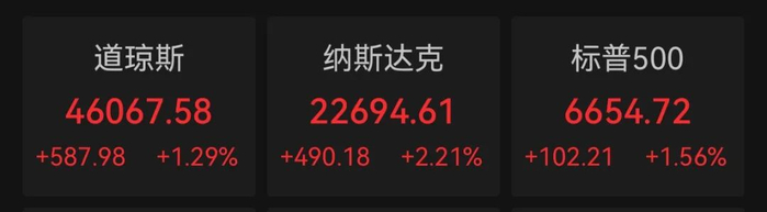 Wind数据显示,美股三大指数全面反弹,截至当地时间10月13日收盘,道琼斯工业平均指数上涨1.29%,标普500指数上涨1.56%,纳斯达克综合指数上涨2.21%。