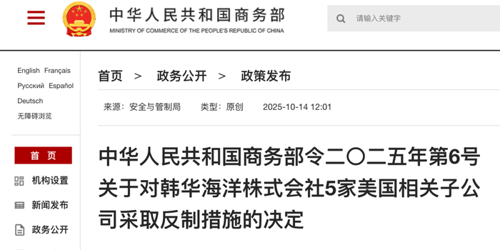 为反制美国对中国采取海事、物流和造船业301调查措施,经国家反外国制裁工作协调机制批准,现公布《关于对韩华海洋株式会社5家美国相关子公司采取反制措施的决定》,自2025年10月14日起施行。