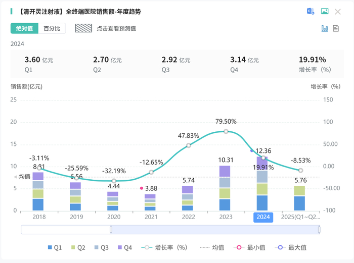 就单品规模而言,据摩熵·医药数据库(全终端医院销售),清开灵注射液2024年在国内的销售额在10亿元之上,其中白云山明兴制药的年销售额领先于其他公司。
