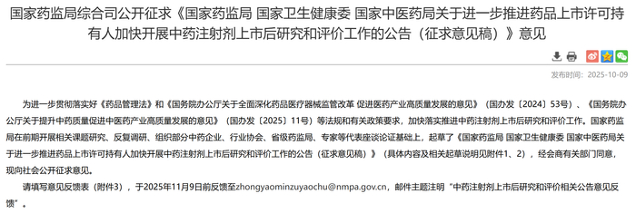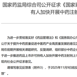 国家药监局现已起草《国家药监局 国家卫生健康委 国家中医药局关于进一步推进药品上市许可持有人加快开展中药注射剂上市后研究和评价工作的公告(征求意见稿)》(下称“《加快中药注射剂上市后研究(征求意见稿)》”),并向社会公开征求意见。