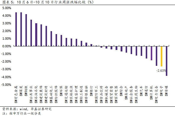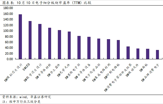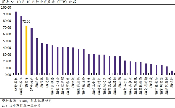 跨行业比较,10月6日- 10月10日当周,申万一级行业涨跌呈分化的态势。其中电子行业下降2.63%,位列第30位。估值前三的行业为计算机、国防军工、电子,电子行业市盈率为72.56。