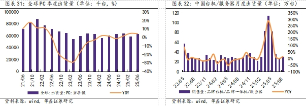 个人电脑方面,2025年第一季度,全球PC出货量同比上升4.75%;第二季度全球PC出货量同比上升4.43%。2025年8月,国内品牌台机出货量达到31.36万台,同比增长15.84%。回顾历史,2020-2021年疫情带来居家办公需求快速上升,推动PC重回增长轨道,但疫情带来的短期复苏结束后PC重回弱势趋势,在2022Q2开始进入下行区间,2023Q3开始出货量同比降幅逐步收窄,全年品牌台机/品牌一体机/服务器出货量同比微增2.62%。AI大模型落地给PC产业链带来新的创新驱动力,另外PC换机潮的到来,2025年PC市场有望恢复增长。