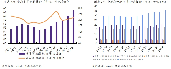 全球半导体销售额自2024年4月份触底以来逐步攀升,6月出现下降趋势。2025年8月,全球半导体当月销售额为648.8亿美元,同比增长21.70%,环比增长4.41%,其中中国销售额为 176.3亿美元,环比上升3.34%,占比达27.17%。自2024年2月以来,全球半导体销售额同比连续保持正增长,半导体行业景气度提升显著,2025年6月增速开始放缓。
