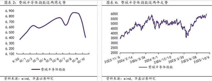 从数据来看,10月6日-10月10日当周,费城半导体指数呈现先升后降的态势,近两周整体处于震荡下行的态势。更长时间维度上来看,2023年10月底开始持续上涨。2024年上半年整体处于上升态势,7月出现大幅回调,8月处于震荡下行行情,9月出现探底回升,四季度总体处于震荡的态势。2025年一季度呈现先涨后跌的走势,4月后逐渐回升,二季度三季度均呈现震荡上行的态势。