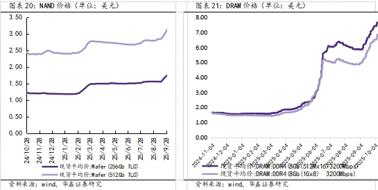 尽管上游头部供应商陆续宣布减产,但由于消费电子市场需求疲软,存储芯片价格整体呈现波动下降趋势。NAND方面:Wafer:512GbTLC现货平均价从2023年7月底开始回升,随后从2024年3月底进入小幅回升,10月出现小幅下跌后变化趋于平缓,2025年3月以来小幅上涨,4月后价格略有下滑,7月后缓慢回升。2025年9月29日价格为3.12美元。DRAM方面:DRAM:DDR4(8Gb(512Mx16),3200Mbps)现货平均价从2024年3月以来价格略有下滑,6月之后呈现小幅回升态势,9月之后又重回下跌态势,12月以来略有回升后变化趋于平缓,2025年3月以来呈现大幅上涨的态势,8月出现小幅下跌,9月之后开始回升。2025年10月10日价格为7.66美元。