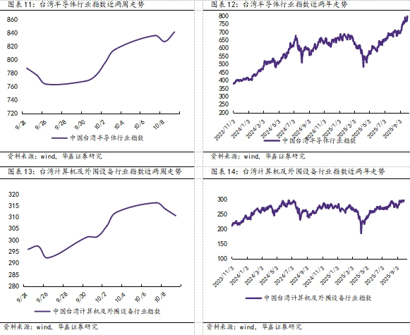 近两周:环比看,9月29日-10月10日两周,台湾半导体行业指数、台湾电子零组件行业指数均呈现震荡上行趋势、台湾计算机外围设备行业指数呈现先震荡上行后下降的趋势;台湾光电行业指数亦呈现先震荡上行后降的趋势。