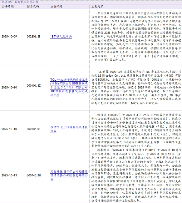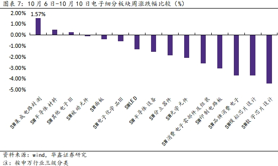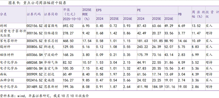 10月6日-10月10日当周,重点关注公司周涨幅前十:电子化学品独占三席,封测、消费电子零部件及组装、家电零部件、膜材料、磁性材料、面板、品牌分销各占一席。通富微电(封测)、信维通信(消费电子零部件及组装)、香农芯创(家电零部件)包揽前三,周涨幅分别为13.52%、11.47%、10.69%