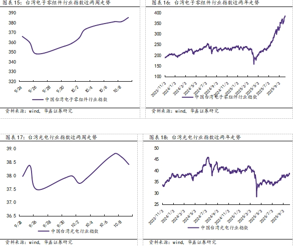 行业指标上,我们依次选取台湾半导体行业指数、台湾计算机及外围设备行业指数、台湾电子零组件行业指数、台湾光电行业指数,来观察行业整体景气。日期上,我们分别截取各指数近两周的日度数据、近两年的周度数据,来考察不同时间维度的变化。