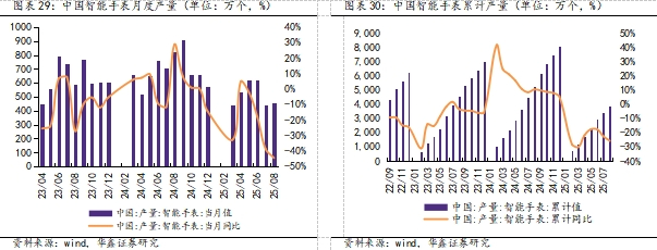中国智能手表进入2024年之后出现反弹,第一季度智能手表累计产量同比增长33.01%,打破近两年的持续下滑趋势,第二季度智能手表累计产量同比增长1.94%,第三季度智能手表累计产量同比增长21.26%,第四季度智能手表累计产量同比增长9.38%,增幅有所缩窄。2025年,第一季度智能手表累计产量同比下降28.95%,第二季度智能手表累计产量同比下降9.94%。我们认为随着生成式AI与终端硬件的结合,智能手表未来有望集成更多AI功能,从而为市场增长开辟新途径。