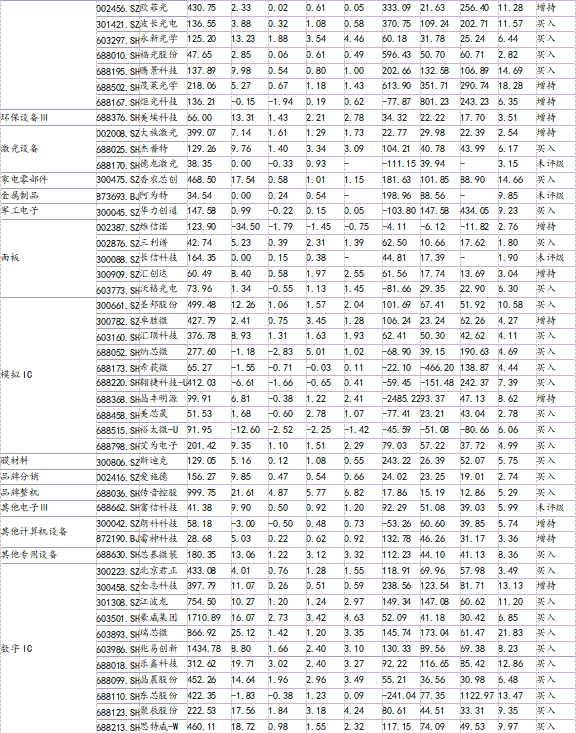 10月6日- 10月10日当周,申万一级行业涨跌呈分化的态势。其中电子行业下降2.63%,位列第30位。估值前三的行业为计算机、国防军工、电子,电子行业市盈率为72.56。电子行业细分板块比较,10月6日-10月10日当周,电子行业细分板块呈涨跌分化态势。其中,集成电路封测涨幅最大,达到1.57%。估值方面,模拟芯片设计、LED、数字芯片设计板块估值水平位列前三,半导体材料和分立器件板块估值排名本周第四、五位。