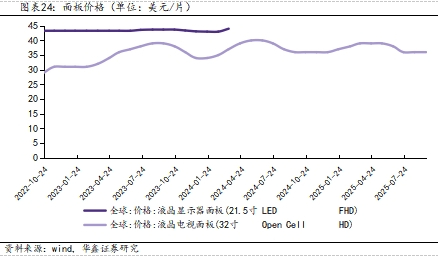 面板价格保持稳定态势。面板价格自2021年7月以来,价格持续下降,目前价格整体保持稳定,其中液晶电视面板:32寸:OpenCell:HD价格近期略有回升,2025年9月23日为36美元/片,液晶显示器面板:21.5寸:LED:FHD价格自2022年8月23日以来,价格逐步由44.3美元/片下降至43美元/片,2024年3月22日价格略有上升,为44美元/片。