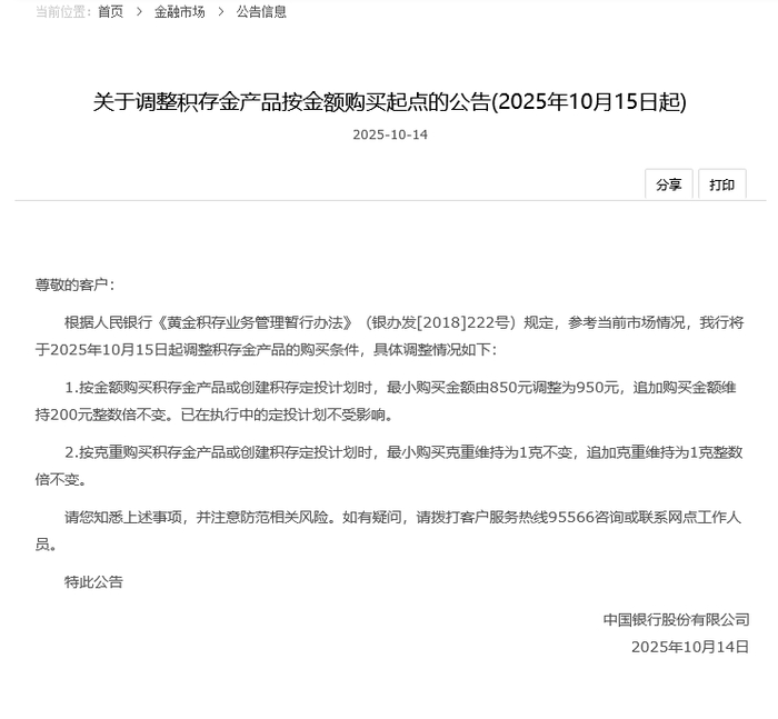 财联社记者注意到,中国银行今日也正式发布了关于调整积存金产品按金额购买起点的公告。在公告中,中国银行表示,根据人民银行《黄金积存业务管理暂行办法》(银办发[2018]222号)规定,参考当前市场情况,该行将于2025年10月15日起调整积存金产品的购买条件。