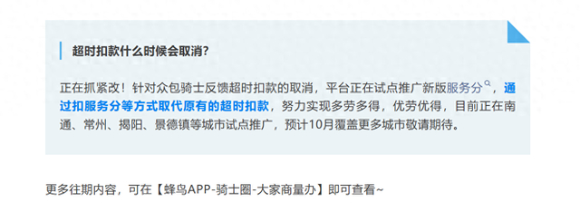 微信公众号“饿了么城市骑士”10月14日消息,“饿了么”平台在回应“超时扣款什么时候会取消”的问题时表示:“正在抓紧改!针对众包骑士反馈超时扣款的取消,平台正在试点推广新版服务分,通过扣服务分等方式取代原有的超时扣款,努力实现多劳多得,优劳优得,目前正在南通、常州、揭阳、景德镇等城市试点推广,预计10月覆盖更多城市敬请期待。”