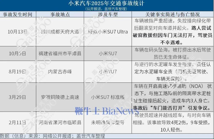 盖世汽车梳理公开报道的信息发现,2025年以来,小米汽车陆续出现过多起事故。其中,本次成都天府大道的事故和3月29日铜陵德上高速事故最引人注目,这两起事故都涉及车门无法打开的问题。