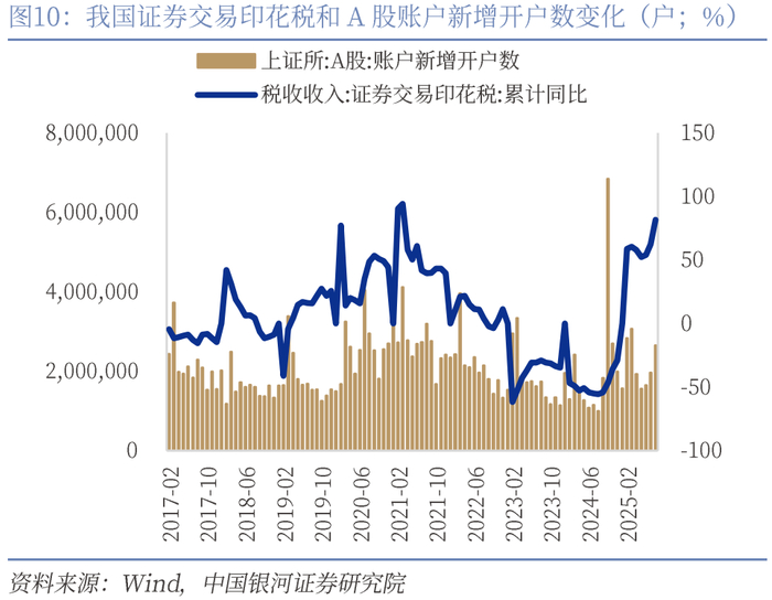 二是印花税保持大幅增长,土地收入延续季节性低位。财政收入延续小幅改善态势,结构延续优化。1-8月一般公共预算收入同比增长0.3%,增幅继续扩大。其中税收收入累计增速实现由负转正,微增0.02%,当月同比增速为3.4%,虽较7月有所回落但仍保持正增长。非税收入增速连续回落,同比增长1.5%,大幅低于过去五年非税收入的平均增速(10.4%)。税收结构分化明显,印花税贡献突出。1-8月印花税同比增长27.4%,其中证券交易印花税同比增长81.7%,占税收收入比重约0.98%,拉动税收增长约0.8个百分点。8月单月证券交易印花税同比增长约2.26倍,创年内次高,主要受益于A股市场活跃度提升,年内A股日均成交额同比增幅达107%。主体税种中,国内增值税增长3.2%,企业所得税由负转正至0.3%,个人所得税保持8.9%的较快增长。然而,与房地产相关的土地增值税和契税分别下降18.3%和15.3%,消费税增速也有所回落,反映出内需及房地产市场仍待提振。土地收入延续季节性低位。1-8月政府性基金收入累计增速-1.4%,降幅有所走阔,或与8月份土地市场热度有所回落有关。8月土地出让收入当月值为2313亿元,累计增速小幅放缓至-4.7%,土地市场成交规模延续季节性低位,并持续同比回落。