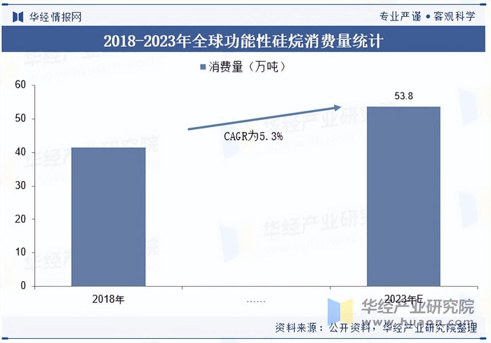 数据显示,2018年全球功能性硅烷消费量约41.6万吨,预计到2023年增长至53.8万吨,2018-2023年CAGR为5.3%。根据预测,到2030年市场规模预计增长至28.5亿美元,2021-2030年CAGR为5.0%。