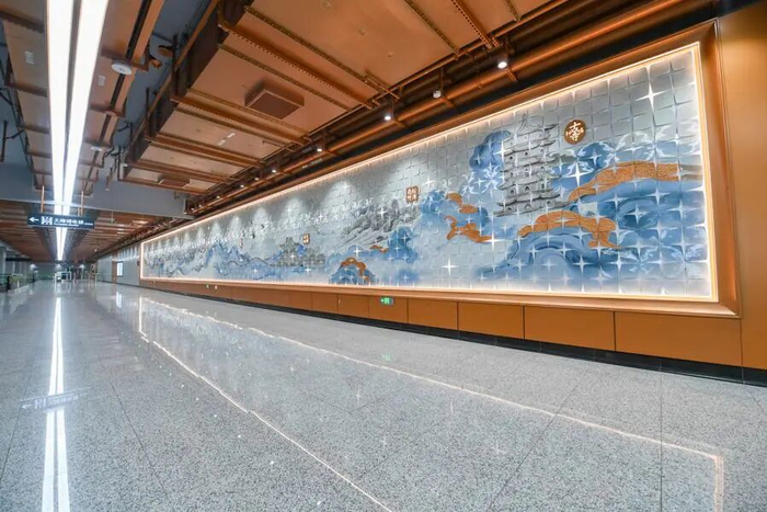 30米长的“蟠龙十景”公共艺术墙是站厅的“文化灵魂”。设计团队从《蟠龙镇志》中提取“江村野店、曲水萦居、柳榆晚照”等十大景致,采用激光雕刻瓷片呈现轮廓,镌刻于艺术墙长卷之上,通过水刀切割的瓷片拼合形成古镇肌理,瓷片缝隙则暗藏嵌入式LED灯带,灯光亮起时如繁星闪烁、似波光流转,碰撞出时空褶皱,带给乘客“一步一景、一时一境”的沉浸式体验,仿佛“一步穿越千年”,实现历史文化与当代艺术的生动对话。