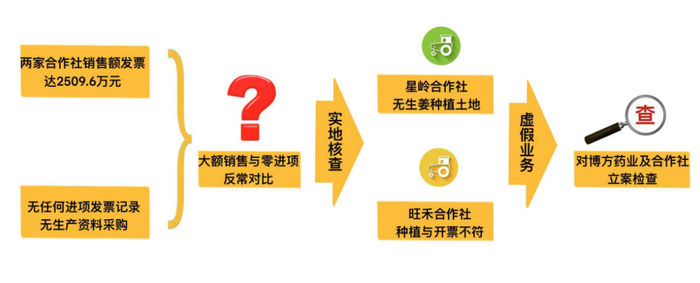 为核实情况,税务人员前往两家合作社的生产经营地实地调查。通过走访得知,星岭合作社在当地没有任何生姜种植土地及种植业务。而旺禾合作社2021年实际未种植生姜,2022年至2023年虽有种植,按实际产量及当时市场平均收购价核算,合理销售额不足100万元,且无外购生姜记录,却向博方药业开具了775.26万元的销售发票。