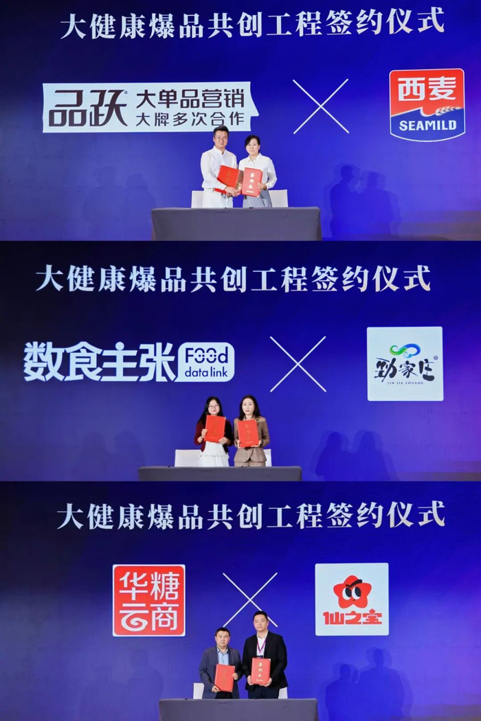 大会上,为共同建立创新、共赢的大健康食品产业生态,打造更多大健康爆品,“大健康爆品共创工程签约仪式” 顺利举行。品跃品类战略营销与西麦食品、FDL数食主张与劲家庄健康食品、华糖云商与仙之宝食品分别达成合作并隆重签约,标志着大健康食品领域跨企业协同创新迈入新阶段。