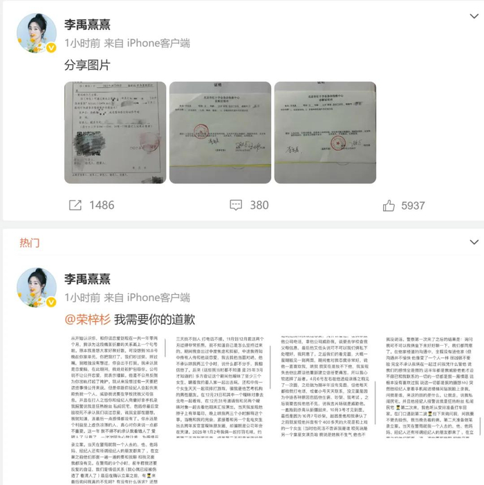 10月15日,女演员李禹熹发文喊话19岁男演员荣梓杉,曝荣梓杉恋爱期间出轨打人,她因其一度确诊中度焦虑和抑郁,并在微博出示立案告知书以及诊断书,诊断书显示,其身体受到多处损伤。