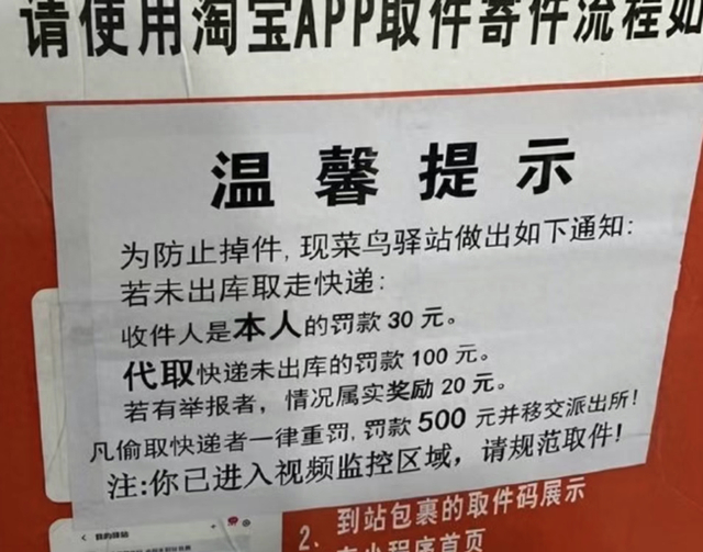 这并非个例,该校菜鸟驿站门口张贴的“温馨提示”明确写着:若未出库取走快递,收件人是本人的罚款30元,代取快递未出库的罚款100元。