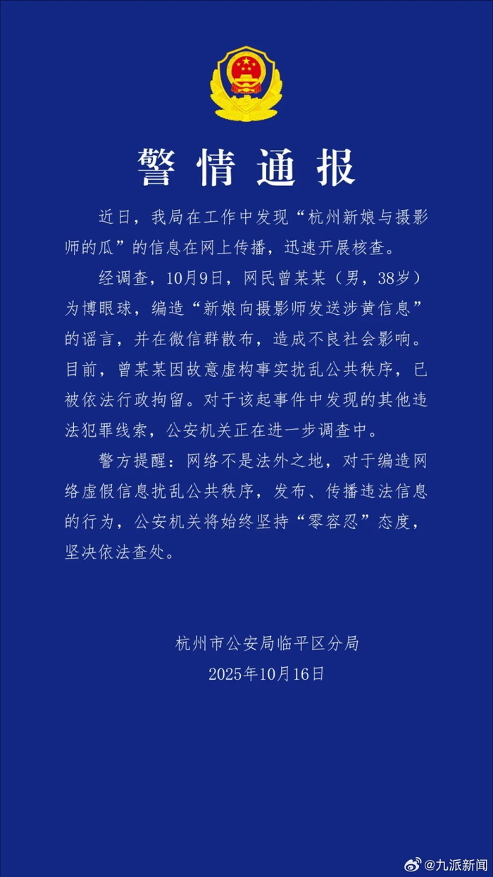 10月16日,杭州临平公安通报:近日,我局在工作中发现“杭州新娘与摄影师的瓜”的信息在网上传播,迅速开展核查。经调查,10月9日,网民曾某某(男,38岁)为博眼球,编造“新娘向摄影师发送涉黄信息”的谣言,并在微信群散布,造成不良社会影响。目前,曾某某因故意虚构事实扰乱公共秩序,已被依法行政拘留。对于该起事件中发现的其他违法犯罪线索,公安机关正在进一步调查中。