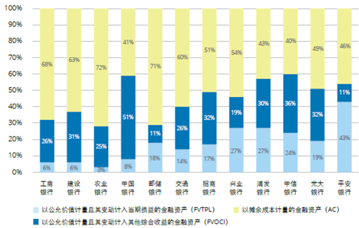 2025年6月末,国有四大银行以公允价值计量且其变动计入当期损益的金融资产(FVTPL)占比均低于10%。境内银行以公允价值计量且其变动计入其他综合收益的金融资产(FVOCI)平均占比为28%,各家银行FVOCI金融资产占比分化。整体来看,国有大型银行为发挥大行金融服务主力军作用,持续服务实体经济发展,地方政府债等配置比例较高并持有到期,以摊余成本计量的金融资产占比普遍较高。股份制银行金融资产投资品种更为丰富,相较于国有大型银行,所持有的以公允价值计量的金融资产占比相对较高。